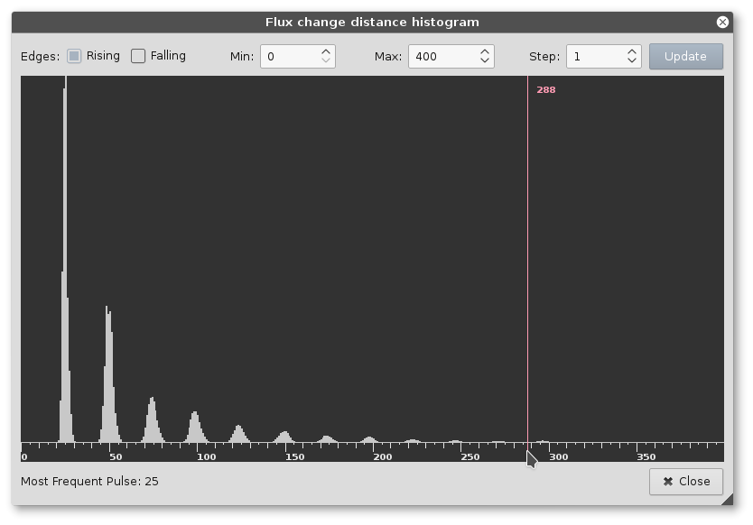 “The real problem I see is the processing power needed to do that sampling _reliably_. 1600BPI = 3200 flux changes per inch. At 20in/s (slowest drive speed I know of) it means 64kHz signal. Taking Nyquist frequency into account we need to sample at 128kS/s, but from my experience with such a type of signals (where clocking “floats” due to physical nature of media and drive) we need at least 5x-10x more than the signal frequency, so at least 320kS/s. Now, I don’t know how fast the Qualstar drive goes, but fastest speed for 1600BPI is 200in/s, which requires 3.2MS/s… And even 320kS/s can be a problem for an arduino – with 8MHz CPU you have ~25 instructions per sample to spend, in which you need to not only sample the data, store it in a buffer, do some maintenance work, but also send it to a host (not enough memory to store it locally). I really think that fast programmable logic analyzer is the way to go here. The key is to sample the data with precise intervals, otherwise later analysis becomes impossible.”