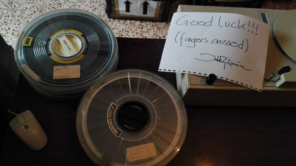 Ci siamo offerti di collaborare da subito in questa impresa, cosi’ ci siamo fatti spedire i nastri, che abbiamo ricevuto tramite corriere, insieme ad un simpatico messaggio di “buona fortuna” che oggi e’ appeso nella nostra biblioteca 🙂